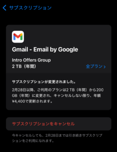 - 昨年:2TBプラン → 約10,400円(Gmail経由)